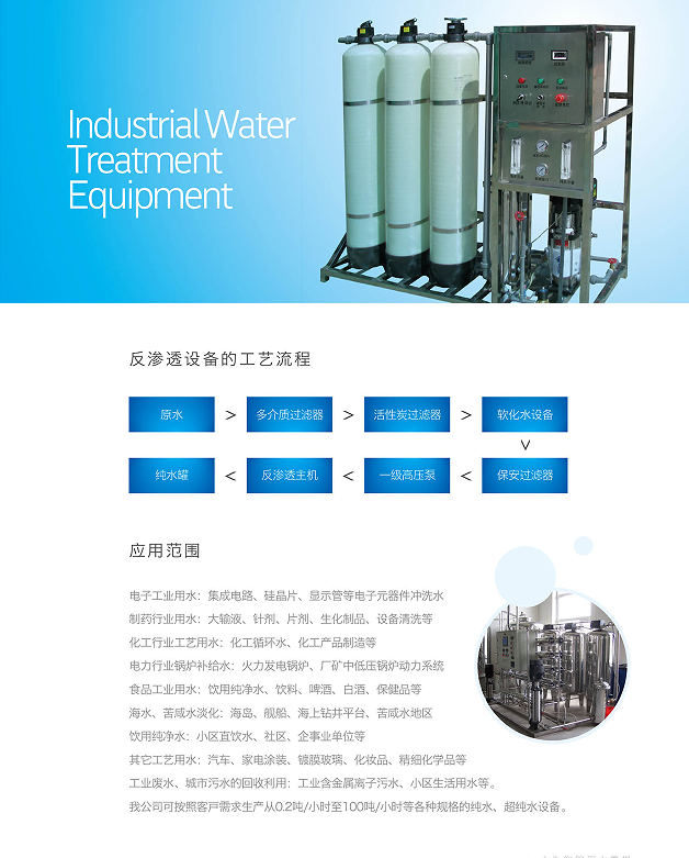 反渗透装置是利用半透膜在压力差的作用下使含盐水脱盐的纯水设备,它与自然渗透的方向相反,故称为反渗透,亦称逆渗透。可以用大于渗透压的反渗透法达到进行分离、提取、纯化的目的。在水处理中,经过预处理的原水高压下可以透过RO膜进入淡水侧,而各种盐分则随高压水流冲击,使水一分为二,从而达到盐与水分离的目的