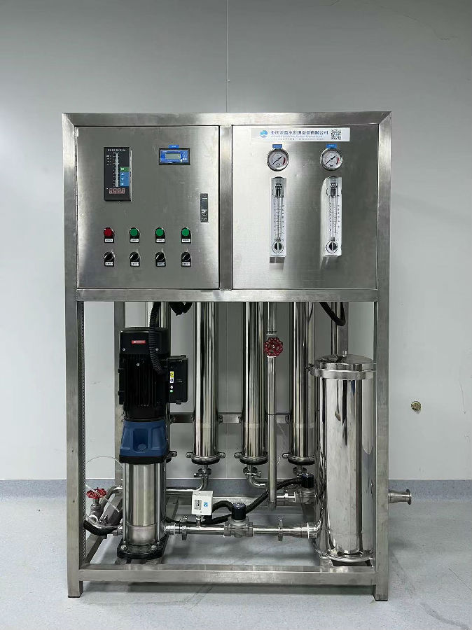 预处理→一级反渗透→加药机(PH调节)→中间水箱→第二级反渗透(正电荷反渗透膜)→纯水箱→纯水泵→EDI装置→紫外线杀菌器→0.22μm精密过滤器→用水终端(≥18.25MΩ.CM)